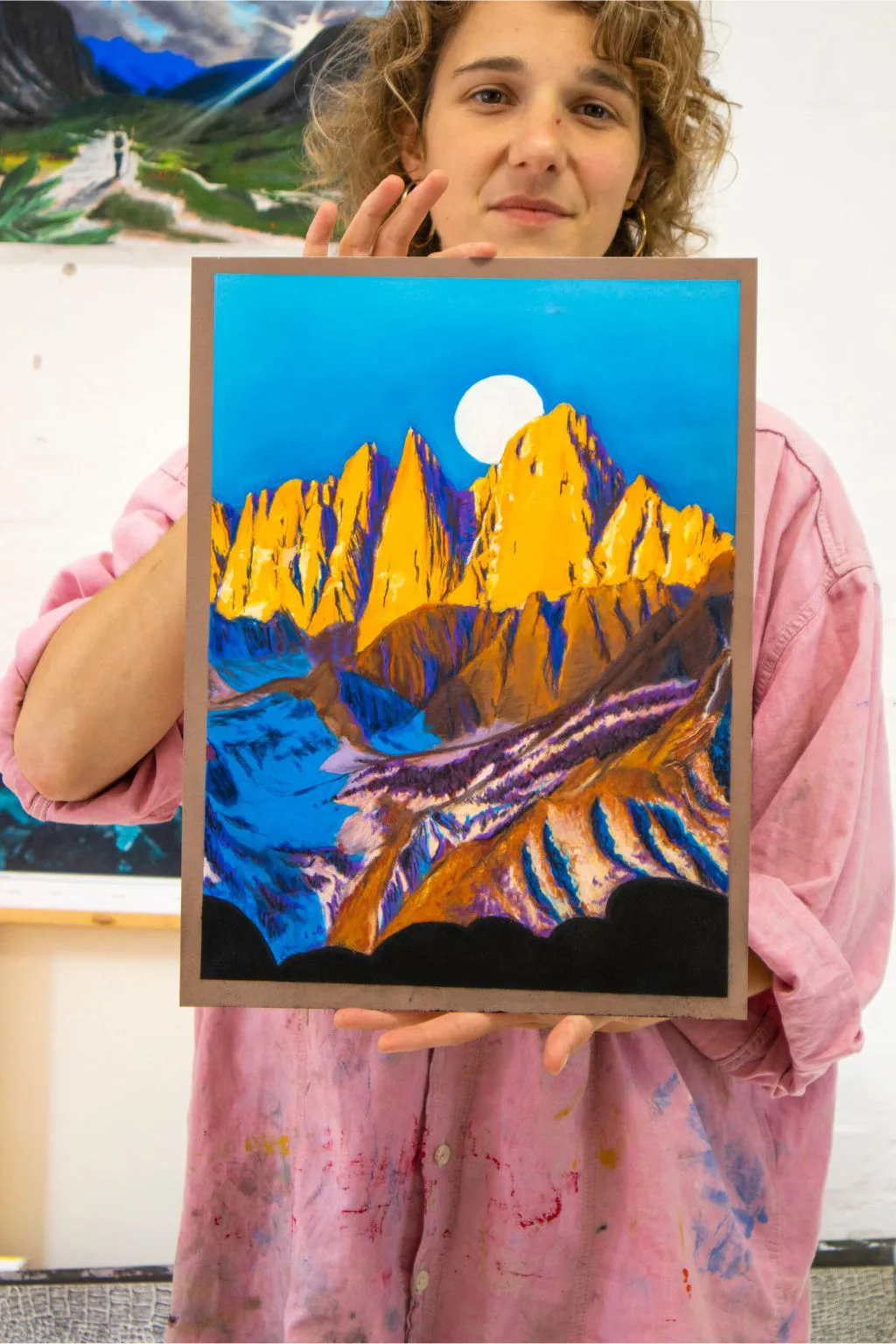 Orange and purple mountains against a bright blue sky with a white, full moon. Made with soft pastels on pastelmat paper. Medium-sized artwork that works well on smaller wall spaces. Size: 30 x 40 cm